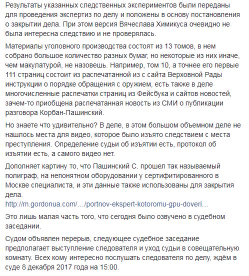 "Материалы уголовного производства состоят из 13 томов, в нем собрано большое количество разных бумаг, но некоторые из них иначе, чем макулатурой, не назовешь. Например, том 10, а точнее его первые 111 страниц состоит из распечатанной из с сайта Верховной Рады инструкции о порядке обращения с оружием, есть также в деле многочисленные распечатки страниц из Фейсбука и сайтов новостей, зачем-то приобщена распечатанная новость из СМИ о публикации разговора Корбан-Пашинский", - пишет Паринова.
