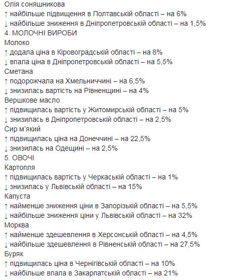В Донецкой области сразу на 4 социальных продуктов цены выросли наибольшими темпами. В Киеве и Житомирской наиболее выросла цена на 3 наименования социальных продуктов, в Закарпатской и Черкасской облостях - по 2 наименования.