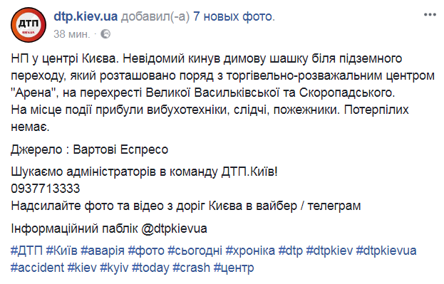 “ЧП в центре Киева. Неизвестный бросил дымовую шашку у подземного перехода, который расположен рядом с торгово-развлекательным центром "Арена", на перекрестке Большой Васильковской и Скоропадского", - говорится в сообщении.