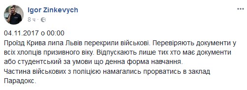 В ночь на субботу, 4 ноября, военные перекрыли проезд Кривая Липа в центре Львова и проверяли документы у мужчин призывного возраста. Об этом сообщил депутат Львовского городского совета Игорь Зинкевич на своей странице в Facebook .
