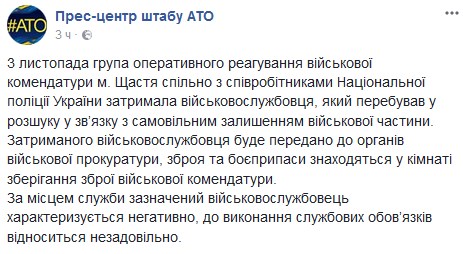 "3 ноября группа оперативного реагирования военной комендатуры города Счастье совместно с сотрудниками Национальной полиции Украины задержала военнослужащего, находившегося в розыске в связи с самовольным оставлением воинской части", - говорится в сообщении.