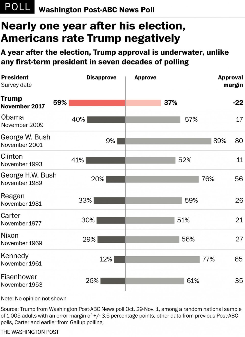 Рейтинг одобрения деятельности Трампа явно ниже, чем рейтинги всех предыдущих президентов США, через год после вступления в должность, за последние 70 лет.