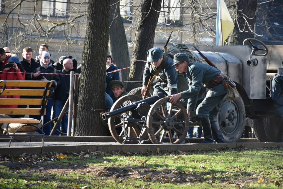 Кроме того, общественная организация "Общество поиска жертв войны "Память" провела перед Ратушей и в сквере "На Валах" театрализованное военно-историческое действо "Бои за столицу – Львов", которое воссоздало события 1918 года.
