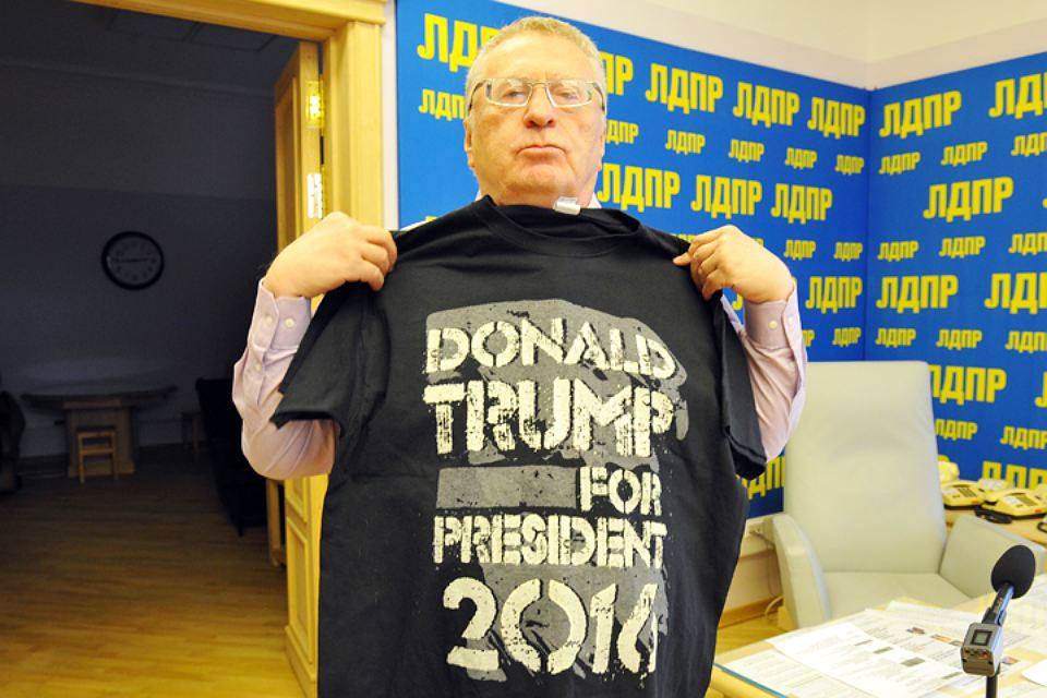 Известно происхождение этого фото. Журналисты российской "Комсомольской правды" беседовали с Жириновским накануне выборов президента США и подарили ему футболку с Трампом.