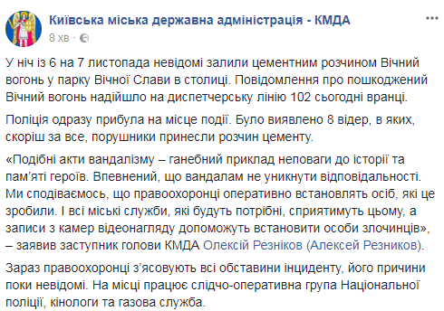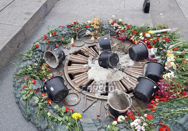 "В ночь с 6 на 7 ноября неизвестные залили цементным раствором Вечный огонь в парке Вечной Славы в столице. Сообщение о поврежденном Вечный огонь поступило на диспетчерскую линию 102 сегодня утром.