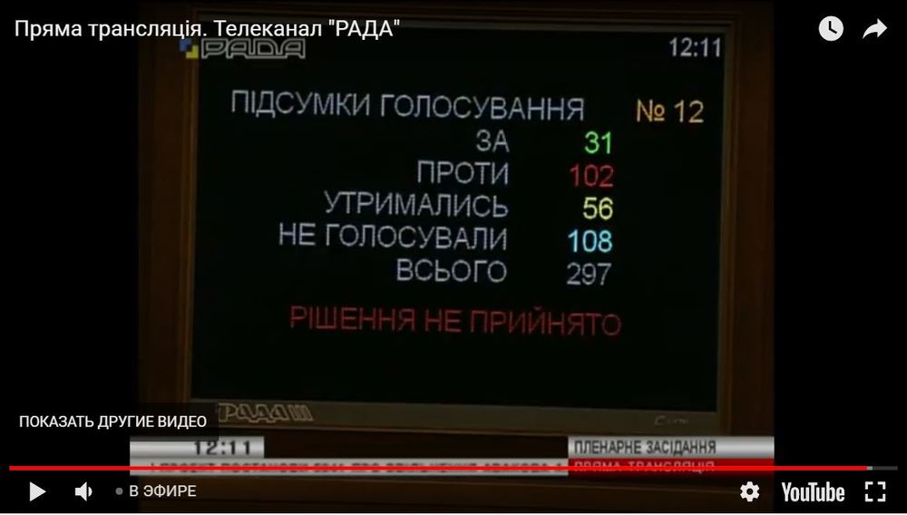 102 нардепа проголосовали "против", 56 воздержались и не голосовали 108 человек.
