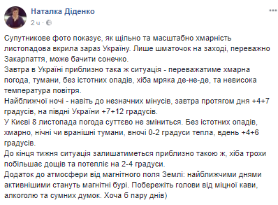 В атмосферу добавятся также изменения в магнитном поле Земли: в ближайшие дни активными станут магнитные бури. "Поберегите головы от крепкого кофе, алкоголя и грустных мыслей. Хотя бы несколько дней", - отмечает синоптик Наталья Диденко на своей странице в Facebook.