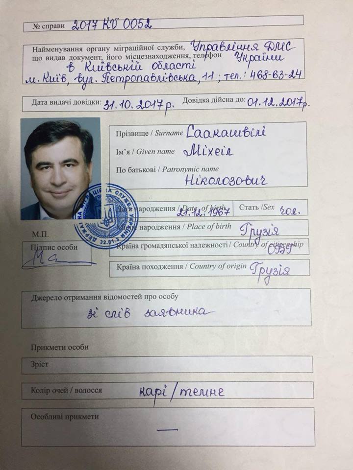 Лишенный украинского гражданства экс-глава Одесской обладминистрации и экс-президент Грузии Михаил Саакашвили заявляет, что получил от Государственной миграционной службы Украины документ, подтверждающий легальность его нахождения на территории Украины.