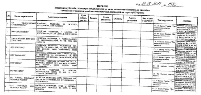 В список запрещенных предприятий вошли компании пищевой промышленности, строительных материалов и оборудования: "Белгородский хладокомбинат", "Стройсервис", "Торговый дом "Донспецстрой", "Волма-ВТР", "Микас", "МК-Метиз", "Группа компаний Пенетрон-Россия", "Торговый дом Пенетрон-Россия", "Пенетрон-экспорт", "Завод гидроизоляционных материалов "Пенетрон", "Снэк-групп", "Лоли-пак экспорт", "Торговый дом "Аромадон", "Торговый дом "Старфуд-юг", "Волма - маркетинг","Народный пластик" и ИП Мирошникова Ирина Владимировна.