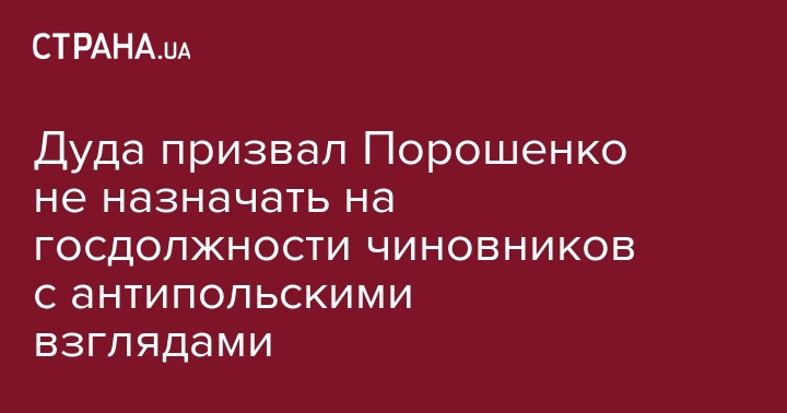 Президент Польши Анджей Дуда призвал президента Украины Петра Порошенко не допускать на важные государственные должности людей с антипольскими взглядами, сообщает "Польске радио".