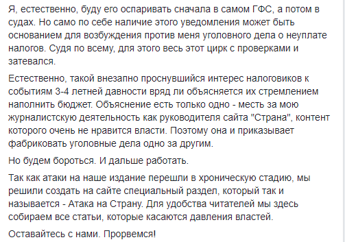 "И вот мне пришло уведомление о налоговом решении с требованием уплатить крупную сумму налогов. Я, естественно, буду его оспаривать сначала в самом ГФС, а потом в судах. Но само по себе наличие этого уведомления может быть основанием для возбуждения против меня уголовного дела о неуплате налогов. Судя по всему, для этого весь этот цирк с проверками и затевался", - считает главред "Страны".