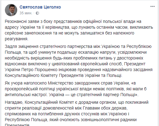 "Для укрепления стратегического партнерства между Украиной и Республикой Польша, и чтобы избежать дальнейшую эскалацию напряжения, осознавая необходимость решения любых проблемных вопросов в двусторонних отношениях исключительно в цивилизованный европейский способ, президент Украины Петр Порошенко инициировал проведение чрезвычайного заседания Консультационного Комитета президентов Украины и Польши", - сообщил пресс-секретарь Порошенко.