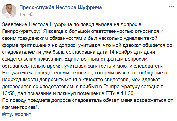 "Учитывая определенный резонанс, который вызвало сообщение о необходимости допросить меня в качестве свидетеля, мой адвокат договорился со следователем, я прибыл в Генпрокуратуру сегодня в 13:50, дал показания и покинул помещение ГПУ в 14:30", – говорится в опубликованном сообщении.