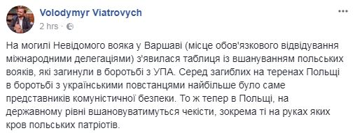 "На могиле Неизвестного солдата в Варшаве (место обязательного посещения международными делегациями) появилась таблица с чествованием польских воинов, погибших в борьбе с УПА. Среди погибших на территории Польши в борьбе с украинскими повстанцами больше всего было именно представителей коммунистической безопасности. Поэтому теперь в Польше, на государственном уровне будут чествовать чекистов, в частности тех, на руках которых кровь польских патриотов", - заявил Вятрович.