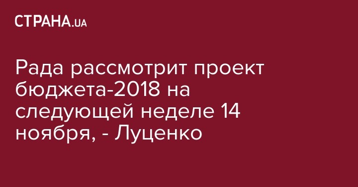 Верховная Рада, вероятней всего, во вторник, 14 ноября, рассмотрит в первом чтении проект закона "О Государственном бюджете Украины на 2018 год". Об этом сообщила представитель президента в парламенте Ирина Луценко, передает "Интерфакс-Украина".