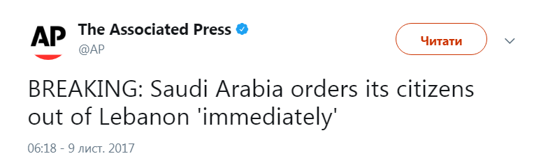Отметим, что 4 ноября стало известно о предотвращении покушения на бывшего премьер-министра Ливана Саада Харири. Находясь с визитом в Саудовской Аравии он подал в отставку "по соображениям собственной безопасности".