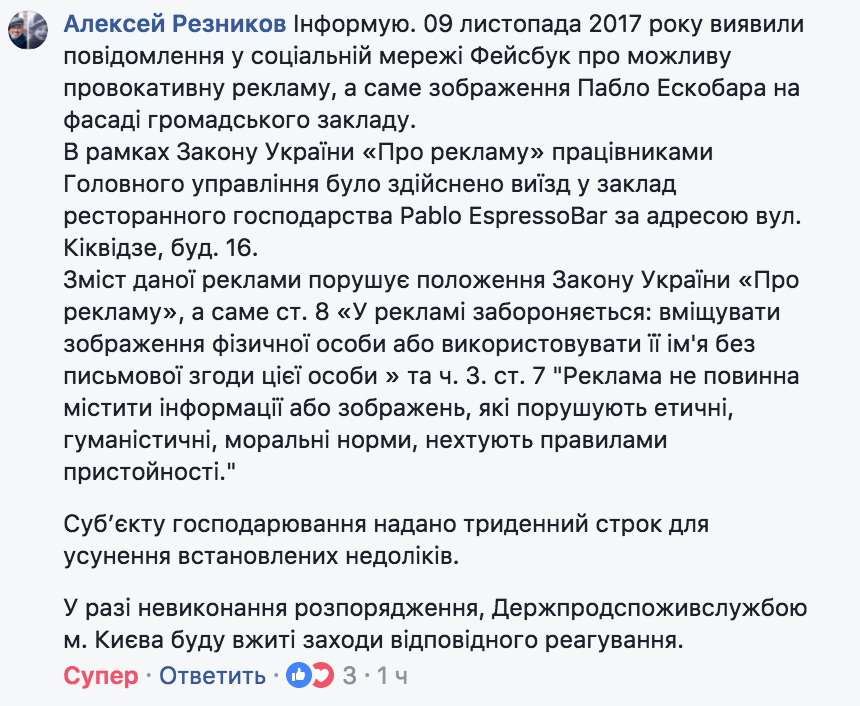 Столичные власти отреагировали на скандал с использованием в рекламе образа наркобарона Пабло Эскобара одним из заведений города. Бару дали три дня на устранение провокационного изображения известного преступника.