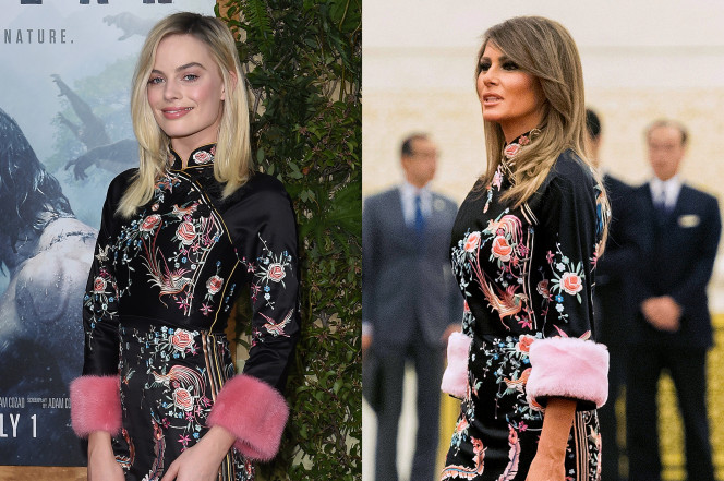 Оказалось, что Мелания надела платье из осенней коллекции Gucci 2016, которая дебютировала на взлетно-посадочной полосе в Милане в феврале 2016 года. Однако, еще в июне 2016 года актриса Марго Робби надевала такое же платье для голливудской премьере "Легенда о Тарзане", пишет New York Post.