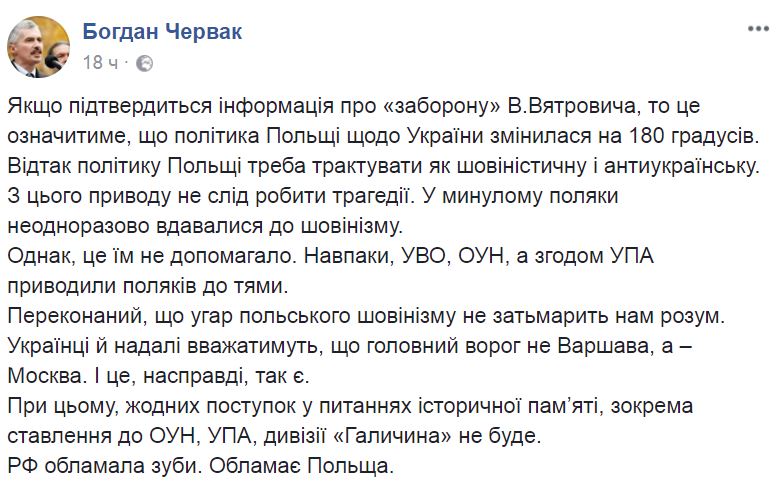 "Если подтвердится информация о "запрете" Вятровича, это будет означать, что политика Польши относительно Украины изменилась на 180 градусов. Поэтому политику Польши надо трактовать как шовинистическую и антиукраинскую. По этому поводу не следует делать трагедии. В прошлом поляки неоднократно прибегали к шовинизму. Однако, это им не помогало. Напротив, УВО, ОУН, а впоследствии УПА приводили поляков в чувство (видимо речь идет в случае с УПА об украино-польском противостоянии в 1943-44 года, которое поляки называют Волынской резней и считают актом геноцида - Прим.Ред.). Убежден, что угар польского шовинизма не омрачит наш разум. Украинцы и дальше должны считать, что главный враг не Варшава, а - Москва. И это на самом деле так. При этом, никаких уступок в вопросах исторической памяти, в частности отношение к ОУН, УПА, дивизии "Галичина" не будет. РФ обломала зубы. Обломает Польша", - заявил Червак.