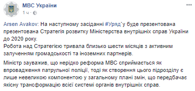В среду, 15 ноября, на заседании Кабмина, министр МВД Арсен Аваков готовится представить стратегию развития ведомства до 2020 года. Об этом сообщает пресс-служба МВД.