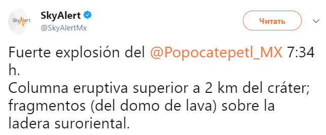 В Центральной Мексике просыпается вулкан Попокатепетль, который периодически извергал пепел с сентября. Об этом сообщает SkyAlert в Twitter.