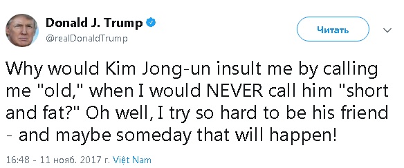 "Зачем Ким Чен Ын оскорбляет меня, называя "старым", ведь я бы никогда не назвал его "толстым коротышкой"? А я ведь так стараюсь стать его другом - и, быть может, однажды это случится!", - написал Трамп.