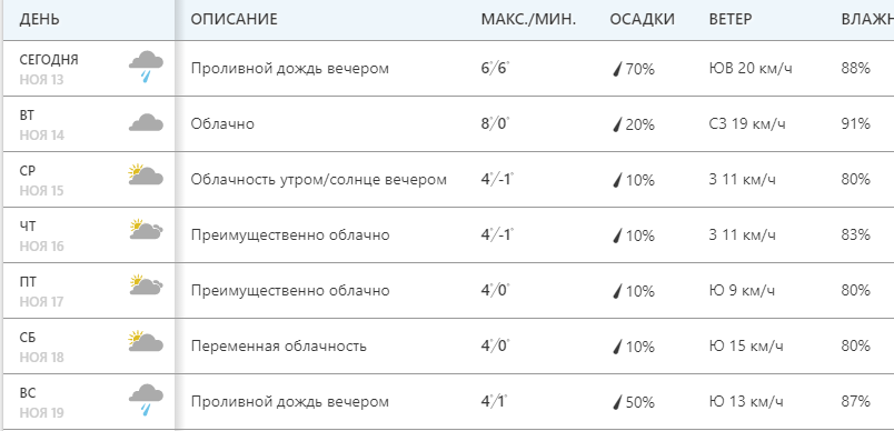 Сайт Weather.com обещает преимущественно переменную облачность без осадков и пасмурную погоду. Сильный дождь возможен в понедельник и воскресенье вечером. Днем +6...+8. Со среды +4.