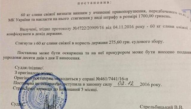 Львовский судья обвинил 60 кило слив в нарушении закона и оштрафовал фрукты