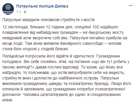 Жители Днепрам 12 ноября заметили на Амурском мосту мужчину, который, видимо, хотел спрыгнуть, и вызвали полицию. Инцидент произошел в воскресенье, 12 ноября, около полудня, сообщает патрульная полиция Днепра в Facebook.