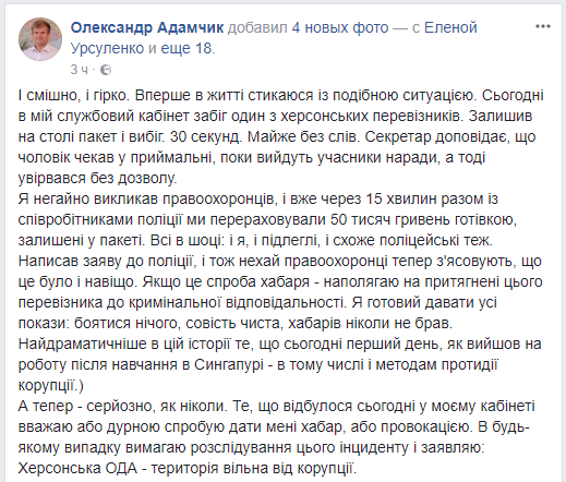 В Херсоне заместителю губернатора Александру Адамчику подбросили взятку в 50 тысяч гривен, после чего он вызвал полицию. Об этом он сообщил в Facebook.