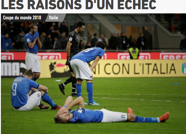 Во Франции газета L'Équipe назвала невыход сборной Италии на ЧМ-2018 как "историческое фиаско".