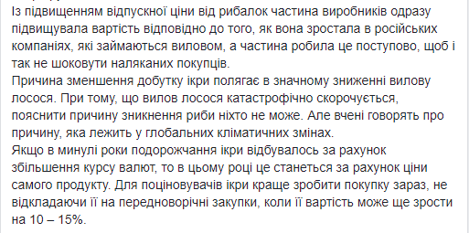 Если в прошлом году подорожание икры происходило за счет увеличения курса валют, то в этом году это произойдет за счет цены самого продукта. В связи с глобальными климатическими изменениями происходит значительное уменьшение вылова лосося и увеличение его цены.