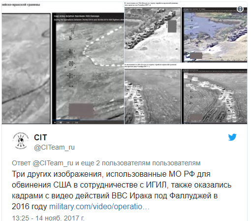 Как заметили авторы Conflict Intelligence Team, три других изображения, использованные МО РФ для обвинения США в сотрудничестве с ИГИЛ, также оказались кадрами с видео действий ВВС Ирака под Фаллуджей в 2016 году.