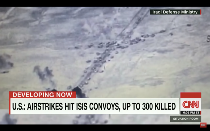 Более того, другое "фотодоказательство" с грузовиками ИГИЛ взято из американской хроники бомбардировок в районе Фаллуджа в 2016 году. Тогда авиаудары США уничтожили около 200 грузовиков террористов.