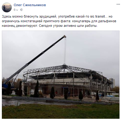 Во вторник, 14 ноября, здание дельфинария "Немо", который в конце октября прекратил работу, демонтировали. Соответствующее фото опубликовал пользователь Олег Синельников на странице в Facebook.
