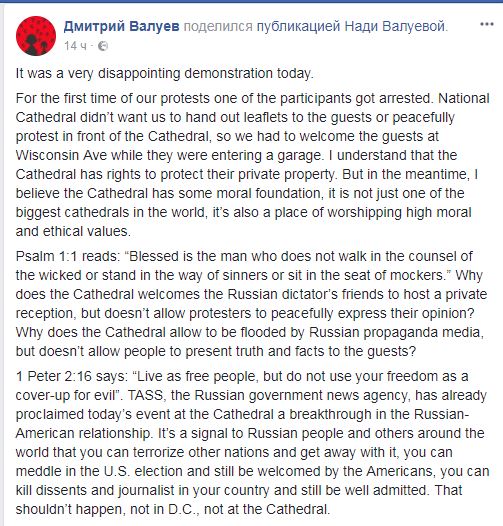 "Это сигнал для российского народа и других людей во всем мире, что вы можете терроризировать другие нации и вам ничего не будет, вы можете вмешиваться в американские выборы, и вас и в дальнейшем будут приглашать американцы, вы можете убивать несогласных и журналистов в вашей стране, и вас будут продолжать признавать. Этого не должно происходить ни в Вашингтоне, ни в Кафедральном Соборе", - подчеркнул активист.
