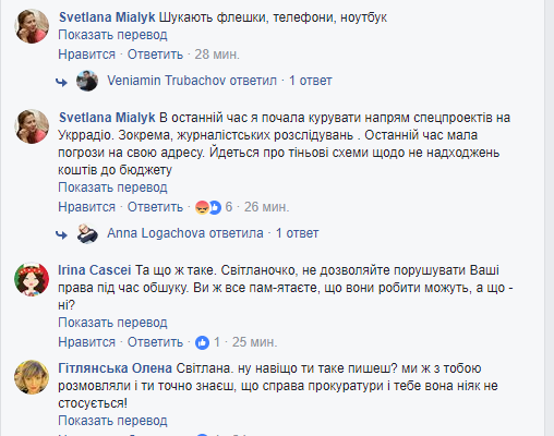 В комментариях к посту журналистки в Facebook внезапно отписалась пресс-секретарь СБУ Елена Гитлянская. Она пишет, что это дело не СБУ, а прокуратуры, и самой Мялик оно не касается.