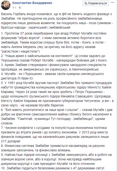 В своем Facebook он перечислил целых 10 общих черт между Робертом Мугабе и Петром Порошенко.