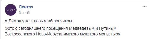 Российский премьер-министр Дмитрий Медведев был замечен с iPhone X. Снимок с политиком был сделан во время посещения им Воскресенского Ново-Иерусалимского монастыря в Истре, пишет iguides.ru.