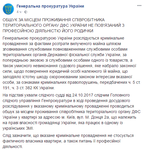 "На основании постановления следственного судьи от 24.10.2017 следователем Главного следственного управления Генпрокуратуры в ходе проведения досудебного расследования в указанном уголовном производстве проводится обыск по месту жительства сотрудника территориального органа ГФС Украины в квартире по адресу г. Киев, ул. М. Донца 2а", - говорится в сообщении ГПУ.