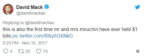 "Это первый раз, когда господин и госпожа Мнучин держат в руках банкноты в $1",  - написал пользователь Дэвид Мак.