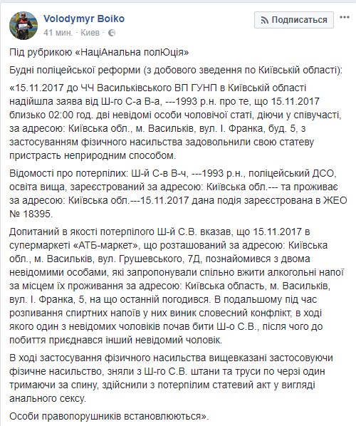 В городе Васильков под Киевом двое мужчин изнасиловали полицейского. Об этом сообщает в Facebook журналист Владимир Бойко со ссылкой на суточную сводку полиции.