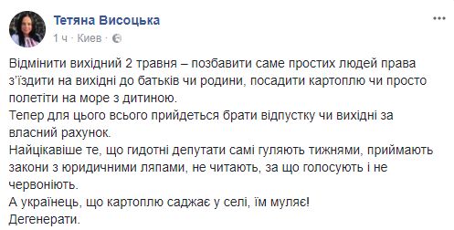 Самое интересное, что эти омерзительные депутаты сами гуляют неделями, принимают законы с юридическими ляпами, не читают, за что голосуют и не краснеют. А украинец, картофель сажает в селе, им мешает! Дегенераты".