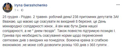 "25 декабря - Рождество. 2 мая - рабочий день! 238 вменяемых депутатов ЗА! Считаю, что у нас еще отменить как выходной 8 марта, это День международной солидарности женщин, и он должен быть Днем нашей солидарности, а не "днем Гвоздик". Также полностью поддерживаю позицию И. Грынива о необходимости отмены нормы о переносе праздничных дней с выходных на понедельник. Воюющая страна со слабой экономикой не может себе позволить роскошь 100 дней из 365 гулять".