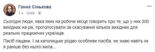 "Сегодня люди, явка которых на рабочее место говорит о том, что в них 300 выходных в год, проголосовали за отмену нескольких выходных для реально работающих украинцев. Спасибо пацаны. И за католическое Рождество особое спасибо. Не знаю даже как я раньше без него жила..."