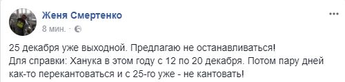 Журналист Евгений Смертенко предлагает официально отмечать и другие праздники: "25 декабря уже выходной. Предлагаю не останавливаться! Для справки: Ханука в этом году с 12 по 20 декабря. Потом пару дней как-то перекантоваться и с 25-го уже - не кантовать!"