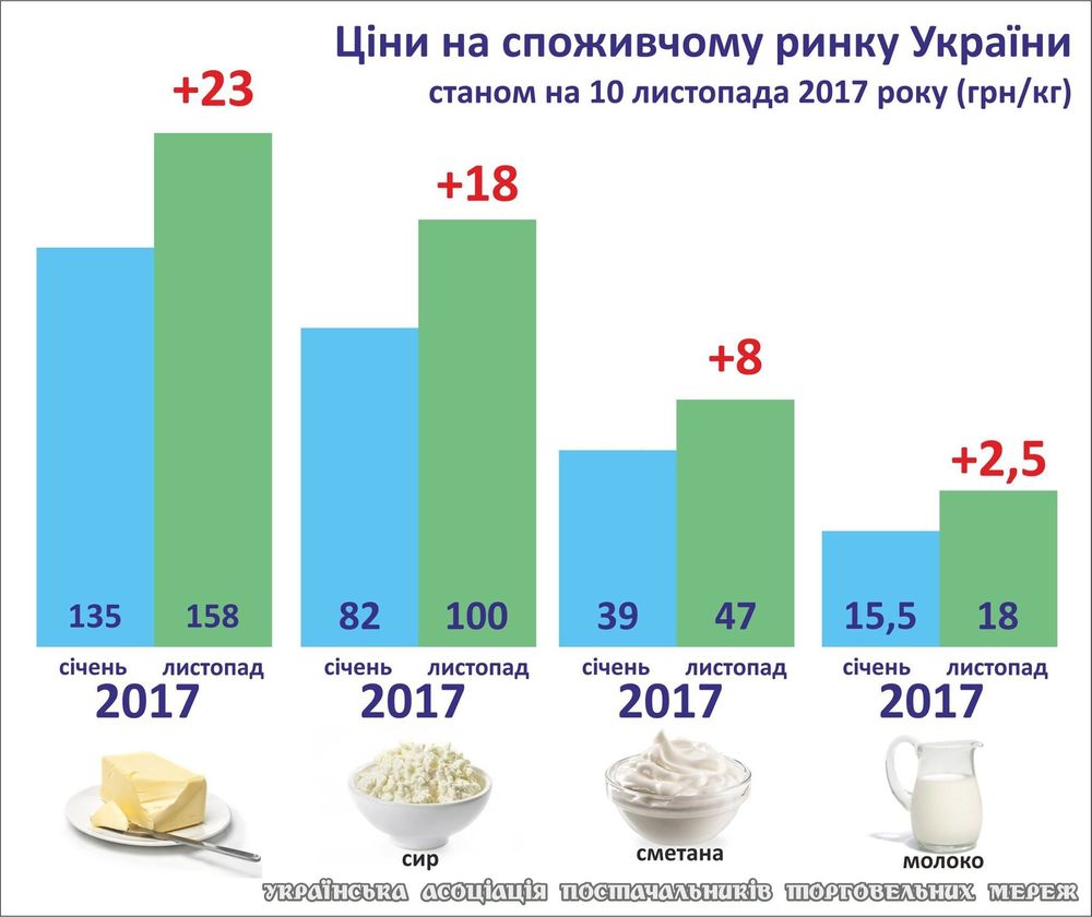 Так, за десять месяцев этого года масло прибавило в цене 23 грн, мягкий сыр - 18 грн, сметана - 8 грн, молоко - 2,5 грн. Теперь килограмм масла можно купить в среднем за 158 грн, сыра мягкого - за 100 грн, сметаны - за 47 грн, молока - за 18 грн.