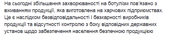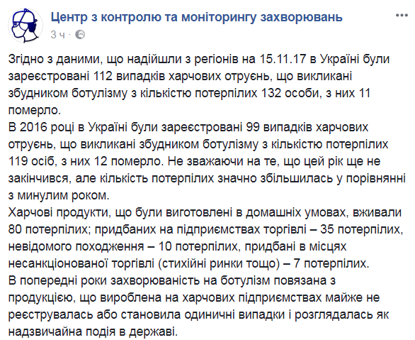 "Согласно данным, поступившим из регионов на 15 ноября, в Украине были зарегистрированы 112 случаев пищевых отравлений, вызванных возбудителем ботулизма с количеством пострадавших 132 человека, из них 11 умерли", - говорится в опубликованном сообщении.