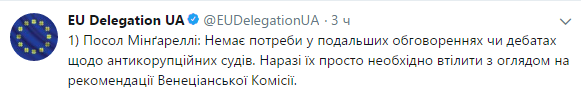 "Нет необходимости в дальнейших обсуждениях или дебатах относительно антикоррупционных судов. Сейчас их просто необходимо воплотить с оглядкой на рекомендации Венецианской комиссии", - цитирует выступление Мингарелли на EBA Annual General Membership Meeting пресс-служба Представительств ЕС на странице микроблоге в Твиттер в пятницу.
