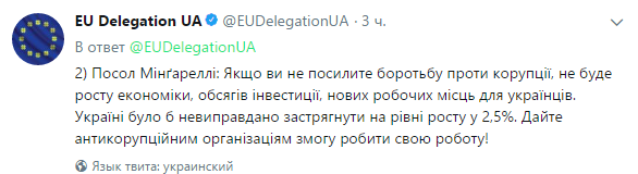 "Если вы не усилите борьбу с коррупцией, не будет роста экономики, объемов инвестиции, новых рабочих мест для украинцев. Украине было бы неоправданно застрять на уровне роста в 2,5%. Дайте антикоррупционным организациям возможность делать свою работу!" - добавил он.